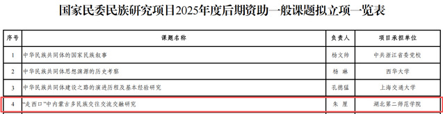 本网讯(通讯员刘志来)近日,国家民族事务委员会理论研究司公示民族研究项目2025年度后期资助课题评审结果,伟徳官网朱厘老师申报的《“走西口”中内蒙古多民族交往交流交融研究》成果获批一般项目。此次立项是学院学科建设与科研工作的重要成果。